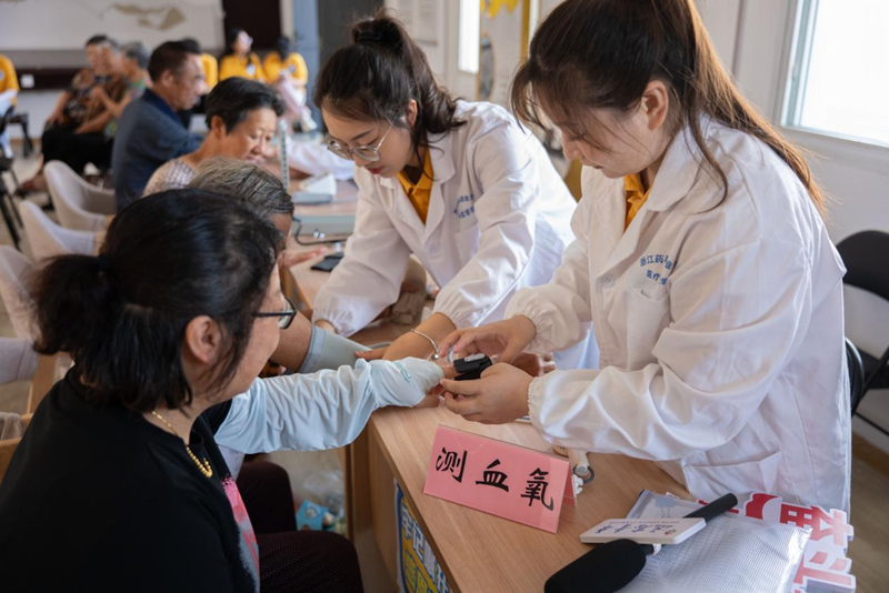 此外,实践队还充分发挥专业优势,开展医药宣讲活动,设立临时医疗点。队员们背靠各自的护理、药学、中药等专业知识,深入田间地头向村民们普及传统医学知识;借助专业检测仪器为村民提供免费健康检测与个性化健康建议;亲手制作水饺赠予百岁老人,用实际行动传递温暖与关爱。