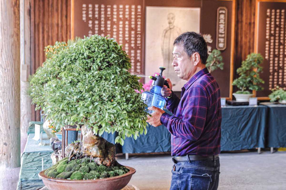 每天清晨,50多岁的方忠海都会早早起来,到庭院内外转一圈,细心地为每一个盆景修枝剪叶。