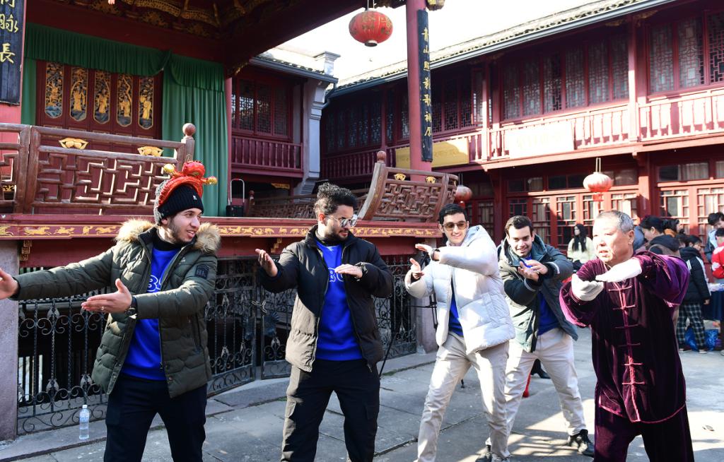 “双脚并立,双手放于身体两侧,然后迈步,手往前四十五度角伸展……”在太极拳老师的耐心教授下,来自也门的阿里和同学们认真学习着太极手势。