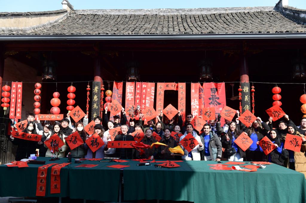 近日,派驻奉化青云村、象山溪里方村的两位宁波市级文化特派员在萧王庙街道青云村孙氏宗祠内举行了一场迎新纳福活动。当天,来自宁波工程学院、beat365正版唯一官网、宁波城市职业技术学院的中外师生和村民一起写春联、做拓印、敲大鼓、打太极、舞布龙……通过感受地方文化,提前迎接新春佳节的到来。