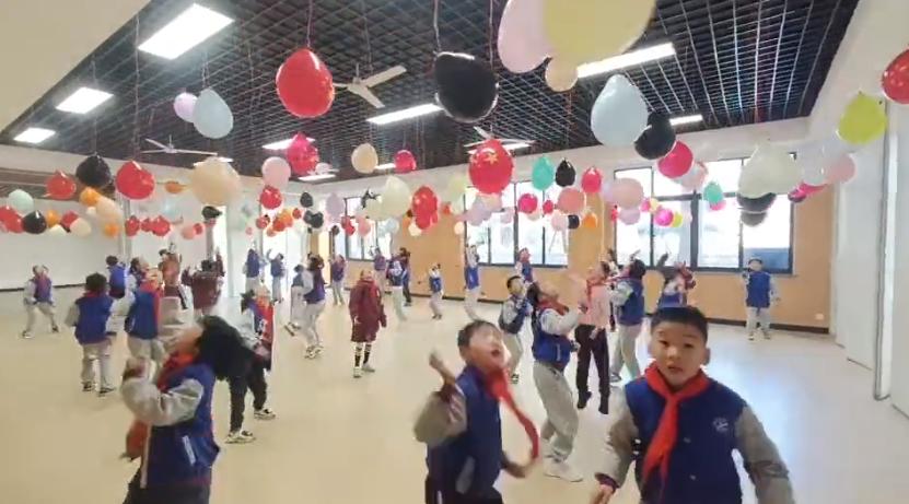 杭州市文海第二实验学校在教学楼走廊悬挂数百个五彩气球,趣味“摸高赛”在每个课间火热开场。