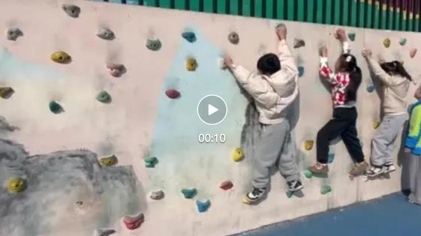 金华市汤溪镇中心小学操场上的观礼台墙壁,上面不仅绘上了秀美的风景,还被安上了五颜六色的攀岩岩点。课余时间,同学们争先恐后前来“飞檐走壁”,仿佛一只只灵巧的小猴子在山水中玩耍。