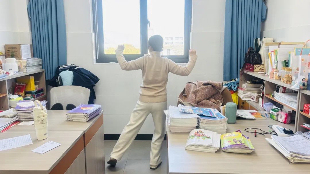 台州市黄岩区江口中心小学教师办公室摇身一变,就成了活力充电站,老师们见缝插针,进行几分钟的核心训练。