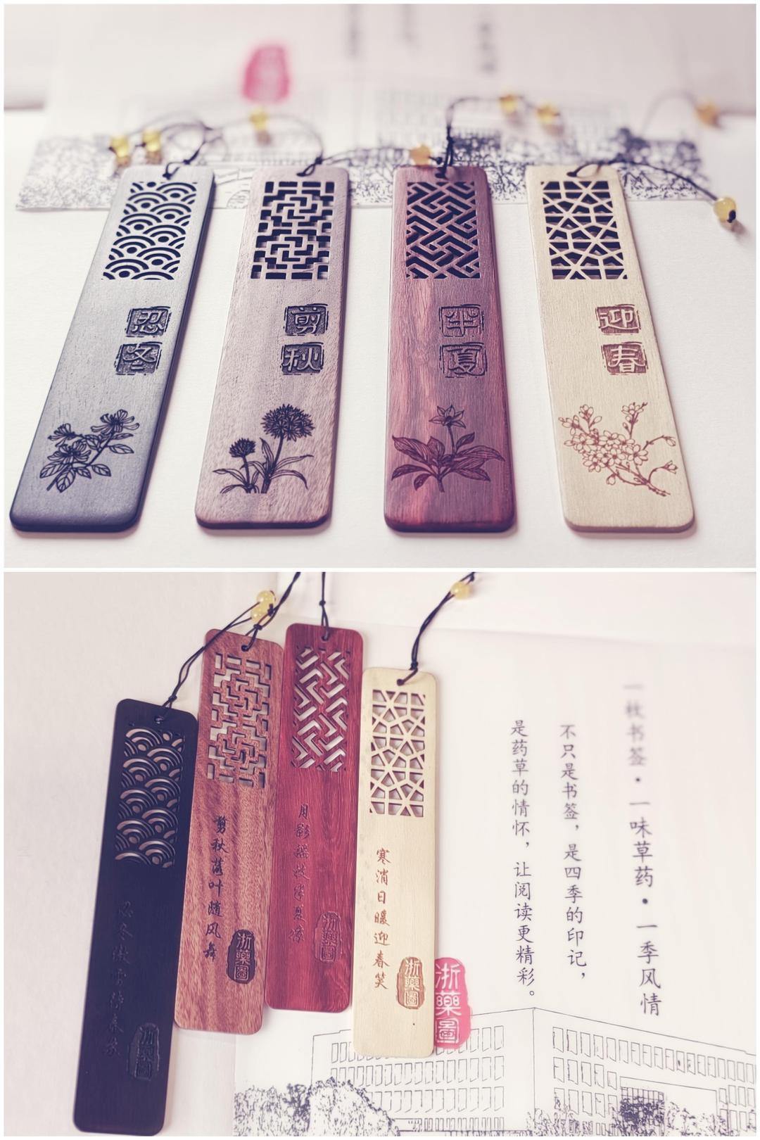 这套文创书签以“四季”为经,以“药语”为纬,将中医药文化、自然时序与人文情怀有机融合。套装包含四枚书签,每枚都选用优质木材精制而成:紫光檀质地坚硬、纹理细密;酸枝木自带独特清香;紫檀木色深沉高贵;楠木温润淡雅。这些天然材质不仅赋予书签独特的质感,更传递出中医药文化崇尚自然的理念。