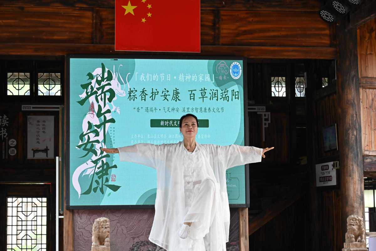 宁波市级文化特派员侯丽娜现场重现古法艾草炮制技艺,带领美育共享导师团打造沉浸式“五感疗愈”盛宴:村民游客亲手制作乙巳年端午限定“溪里有方香养梳”,梳齿通经络,香氛养青丝;菖蒲驱蚊挂饰摇曳生绿意;《养心乐曲》音韵养心,气韵养生舞舒展身姿;本草茶饮理气和脾胃,温补气血焕容光。