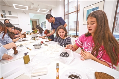 昨天,中河街道一爿艺术空间(一平米博物馆)内,墨香与沉香交织,20余名来自国外的青年与街道楼宇、商圈青年在此共赴一场穿越千年的文化之约。在传拓环节,专业老师带领中外青年共同体验这项千年技艺。