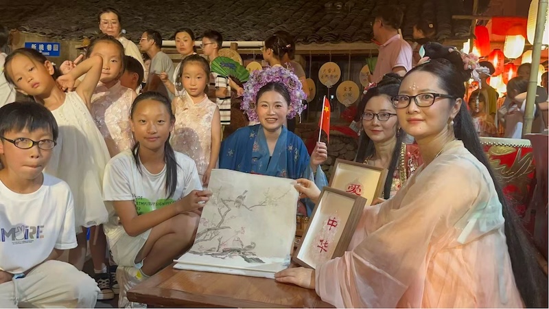 在墙头历史文化街区的中医药文化广场上,“星耀四明·海韵潮音”转角遇艺文艺展演中,文化特派员携手宁波文艺志愿团队的师生们,以匠心独运的艺术构思巧妙融合汉、唐、宋、明等历代雅事与中华传统医药文化,精心创作《九州同游雅事录》等富有时代气息的新颖作品;同时推出“溪里有方·大美健康”系列文创产品《五彩福禄》,将传统美学与现代设计完美结合。宁波市曲艺家协会陈一卿老师即兴创作《九州巷弄里的卖货郎》,以生动的艺术语言再现市井生活的烟火气息,让古老的非遗在皎洁月光下熠熠生辉。
