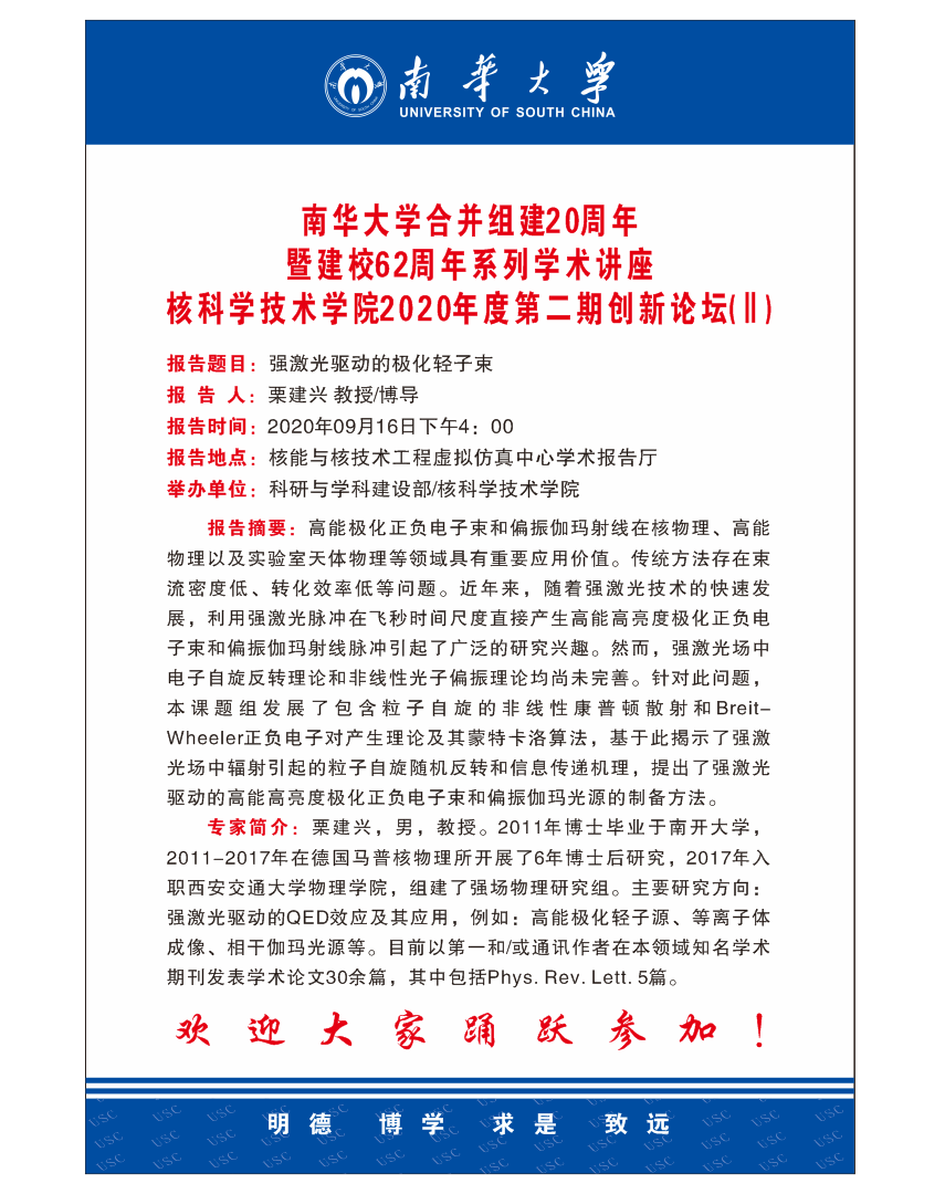 英国365集团公司官网合并组建20周年暨建校62周年系列学术讲座--强激光驱动的极化轻子束