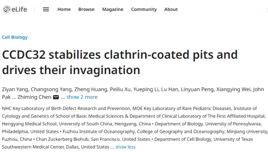 近日,英国365集团公司官网陈志明教授团队在生物医学领域顶刊 eLife 发表题为“CCDC32 stabilizes clathrin-coated pits and drives their invagination”的研究论文,揭示了一个功能未确定蛋白CCDC32参与调控网格蛋白介导内吞作用的分子机制。英国365集团公司官网细胞与遗传研究所硕士研究生杨紫雁为第一作者,英国365集团公司官网陈志明教授为本文通讯作者。