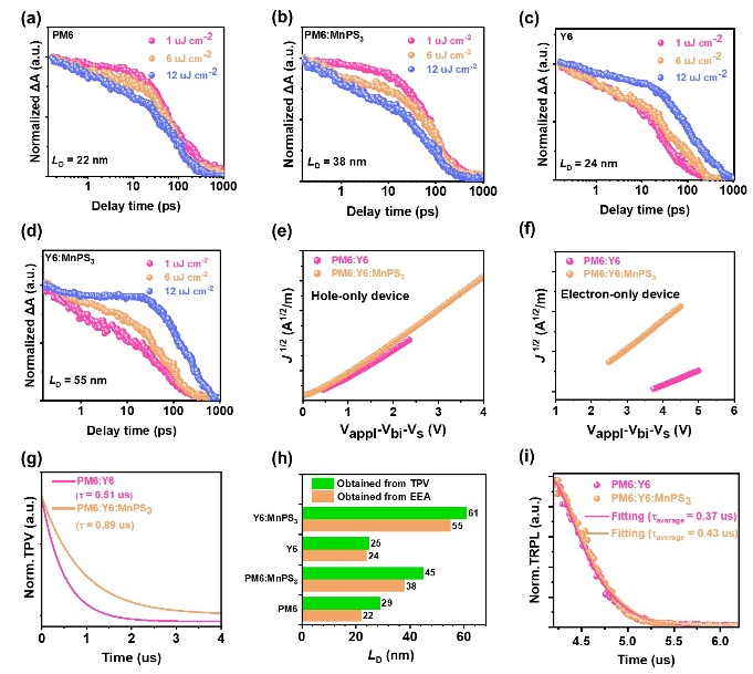 图2. MnPS3纳米片作用下有机太阳电池的激子扩散长度以及电荷传输动力学